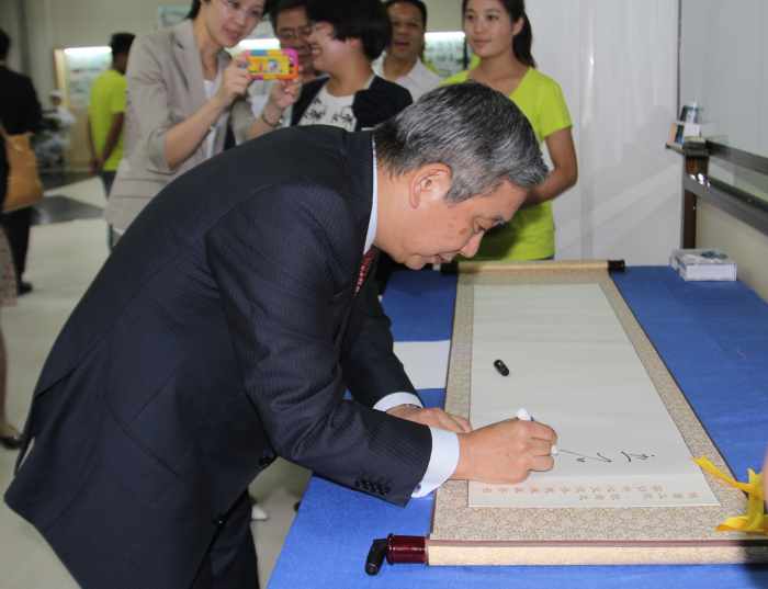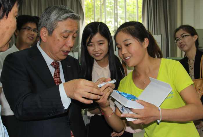 欧姆龙株式会社会长立石文雄在实训室签名留念