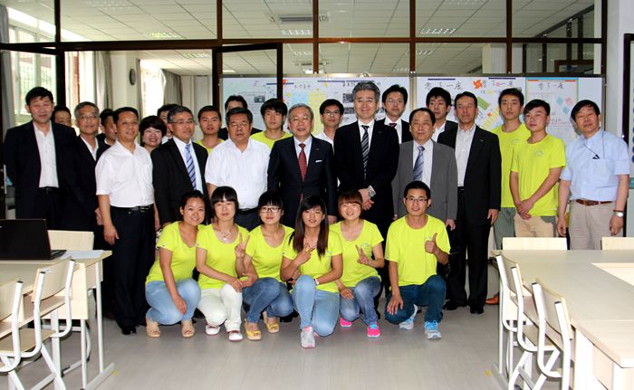 欧姆龙株式会社会长立石文雄一行与正在实训的订单班学生合影