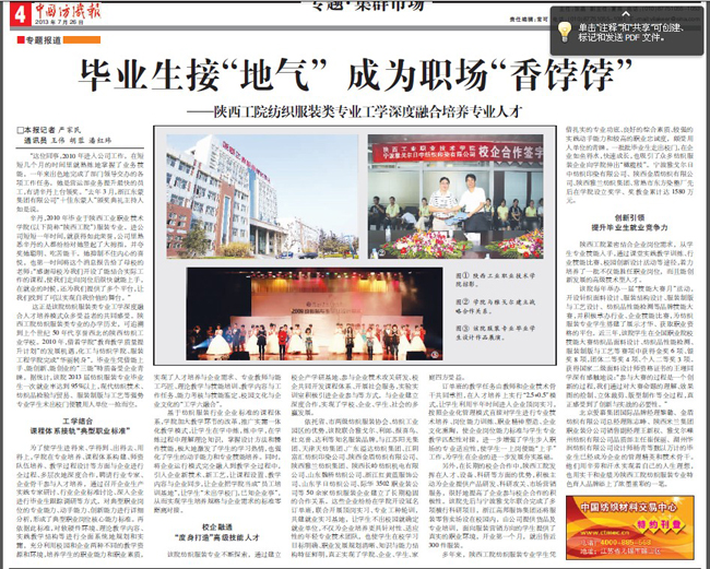 7月26日,《中国纺织报》第四版刊发了记者严家民撰写的《毕业生接“地气”成为职场“香饽饽”》一文,从“工学结合,课程体系接轨典型职业标准”、“校企融通,度身打造高级技能人才”、“创新引领,提升毕业生就业竞争力”三个维度图文并茂地报道了我院纺织服装类专业工学深度融合培养专业人才,毕业生享誉行业企业。