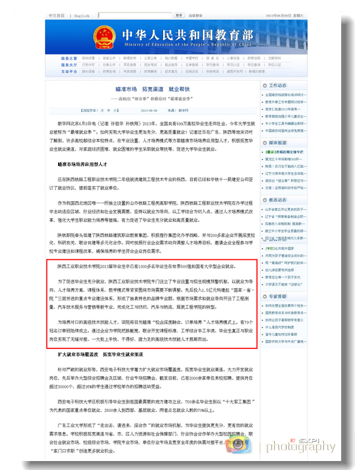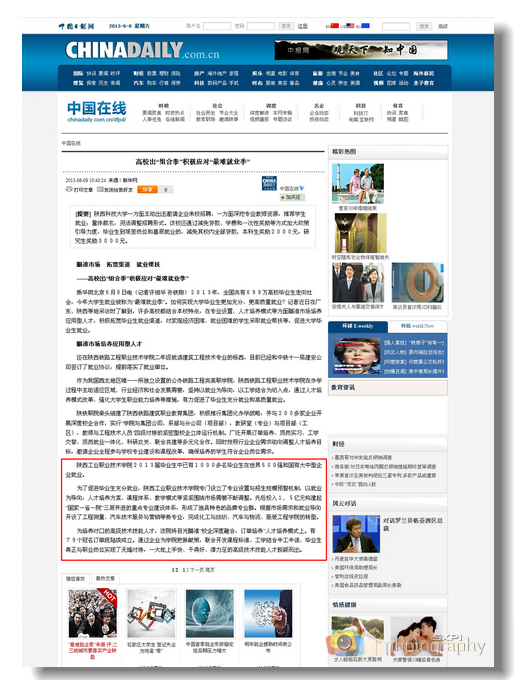 6月8日,中华人民共和国中央人民政府门户网站“中国要闻”栏目、中华人民共和国教育部门户网站、新华网、中国日报网等分别以《高校出组合拳积极应对最难就业季》和《瞄准市场,拓宽渠道,就业帮扶》为题,对我院2013届毕业生高质量、充分就业进行报道。