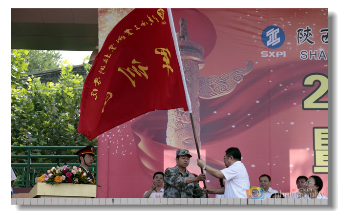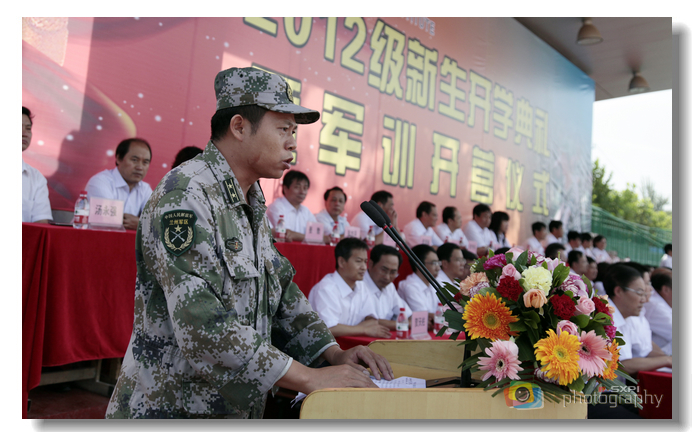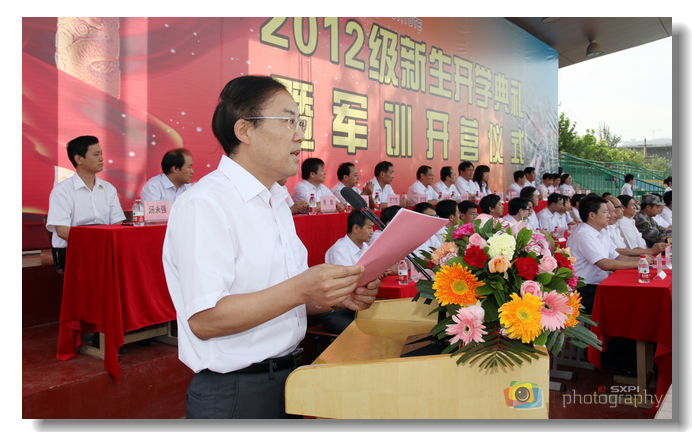 王天哲同志宣布军训编制及任命,在校生和新生代表先后发言。邓志辉同志为2012级新生军训团授旗并宣布2012级新生军训开营。