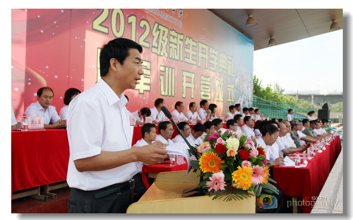 9月3日上午,2012级新生开学典礼暨军训开营仪式在田径运动场隆重举行,标志着我院2012级新生正式开学,为期12天的军训工作全面启动。学院领导邓志辉、崔岩、郑庆战、王天哲、赵嘉骏、王晓江、刘永亮,承训部队参谋长刘晓春、作训科科长段玉川同志出席了大会,相关部门负责人、各二级学院院长、党总支书记、学生工作干部以及全体2012级新生参加了开学典礼暨开营仪式。党委书记邓志辉同志向军训团授旗并宣布2012级新生军训开营,院长崔岩同志发表讲话,党委副书记王天哲同志主持仪式。