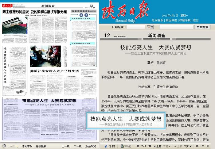 4月1日,《陕西日报》第12版以《技能点亮人生 大赛成就梦想》为题,报道了我院以职业技能大赛为抓手,培养优秀高技能人才的探索和实践,展现了我院以赛促教、以赛促学、以赛精艺的人才培养成效。