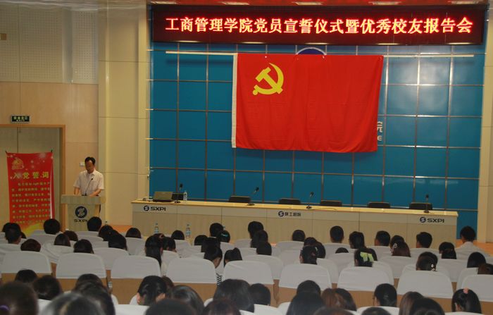 6月27日下午,工商管理学院在学术会堂举行党员宣誓仪式暨优秀校友报告会,学工部部长王超联、团委书记闫军、就业处副处长郝军、工商管理学院党总支书记孙继龙及学工支部全体教师党员和学生党员、入党积极分子等300余...
