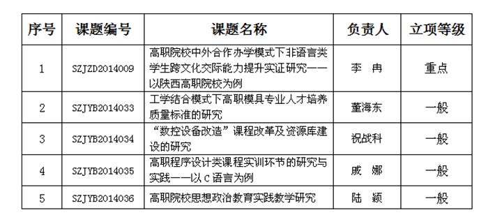 依据陕西省职业技术教育学会《关于公布2014年教育科研规划立项课题的通知》(陕职学【2014】09号文件),我院申报的6项课题,经省职教学会评审,有5项获准立项,其中重点课题1项,一般课题4项。