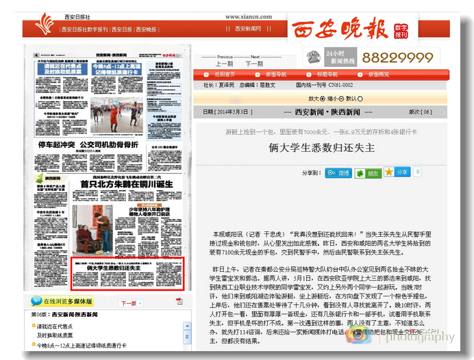 5月3日,《华商报》、《西安晚报》、陕西传媒网、陕西网、西安新闻网等媒体报道了我院土木工程学院工程测量专业1202班雷宝发与同学1日在咸阳湖游玩时捡到装有7000余元现金及银行卡、存折、手机等物的手提包,在民警、...